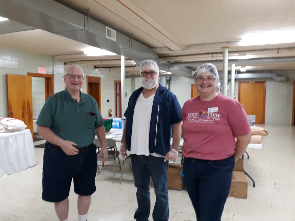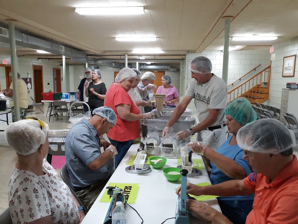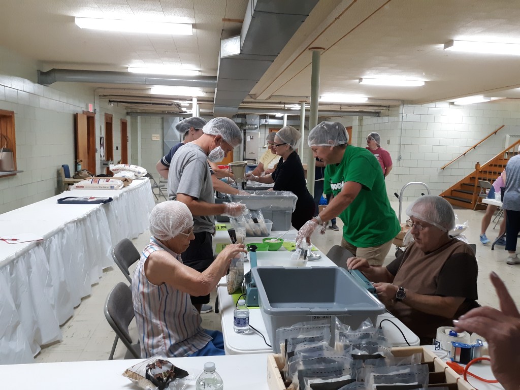 Rice Meal Packing, August 3rd. Picture 1 is one line of packers. Picture 2 is the second line of packers. Picture 3 — Pastor Terry, Tim Copenhaver (kept the line ingredients filled), ?? (Midwest Mission coordinator). Picture 4 — volunteers. Names not listed in order of picture — Tim Copenhaver, Brad Roush, Denise Jones, Denis Hunt, Issaac Hunt, Charmin Copenhaver, Lindsay Boggs, Randy Wells, Jessie F, Mike Baker, Connie Baker, Garry Cutler, Christine Cutler, Eugene Mura, Nancy Lynch, Yolanda Beathwelll (sp), Steve Bingamon, Cheryl Bingamon, Ionna Hayes, Lorraine Hallam, Lori Nixon, Cathy Gipson, Sheila Rappe, Cad Rappe, Russ Hedges, Cheryl Laskowski.